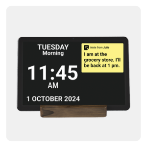 Features a clear, easy-to-read display showing the time, date, day of the week, and whether it’s morning, afternoon, or evening. Caregivers can send reminders, notes, and photos remotely through the app.